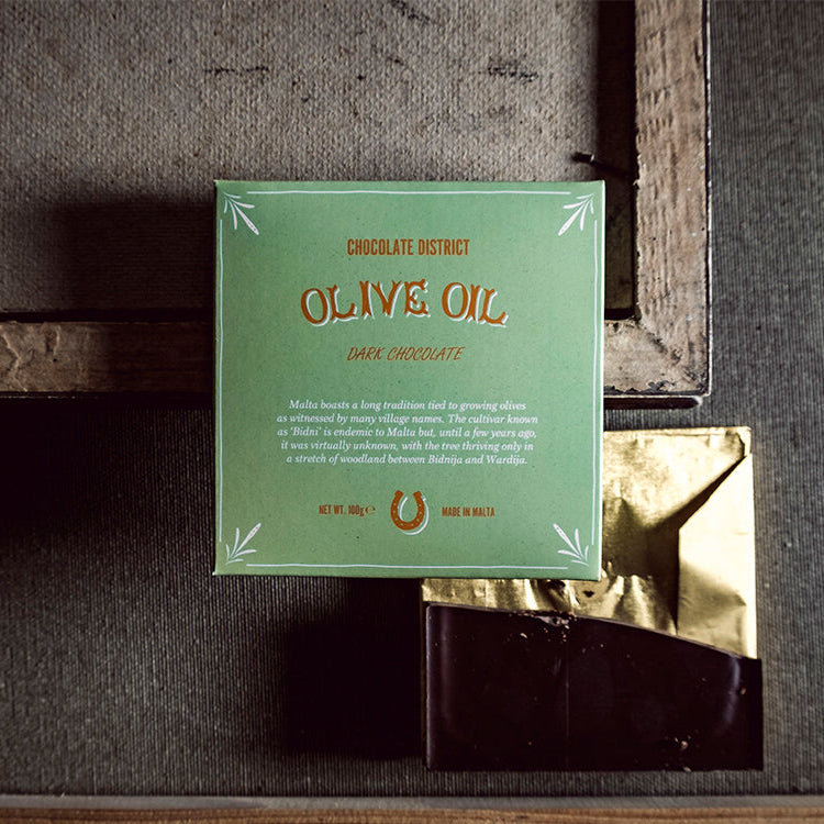 Dark Chocolate infused with the cultivar known as ‘Bidni’, endemic olive tree of Malta. A strong, peppery, buttery melt in your mouth chocolate rich in antioxidants and healthy properties. Packaged in Maltese ”tberfil” style.