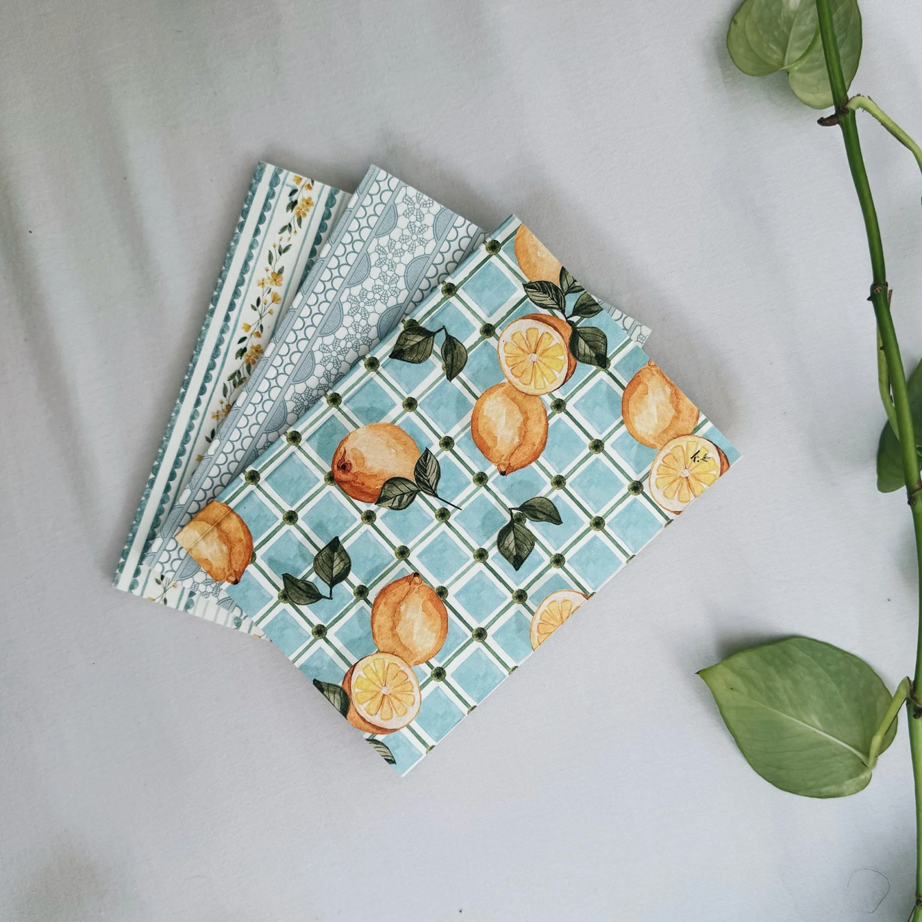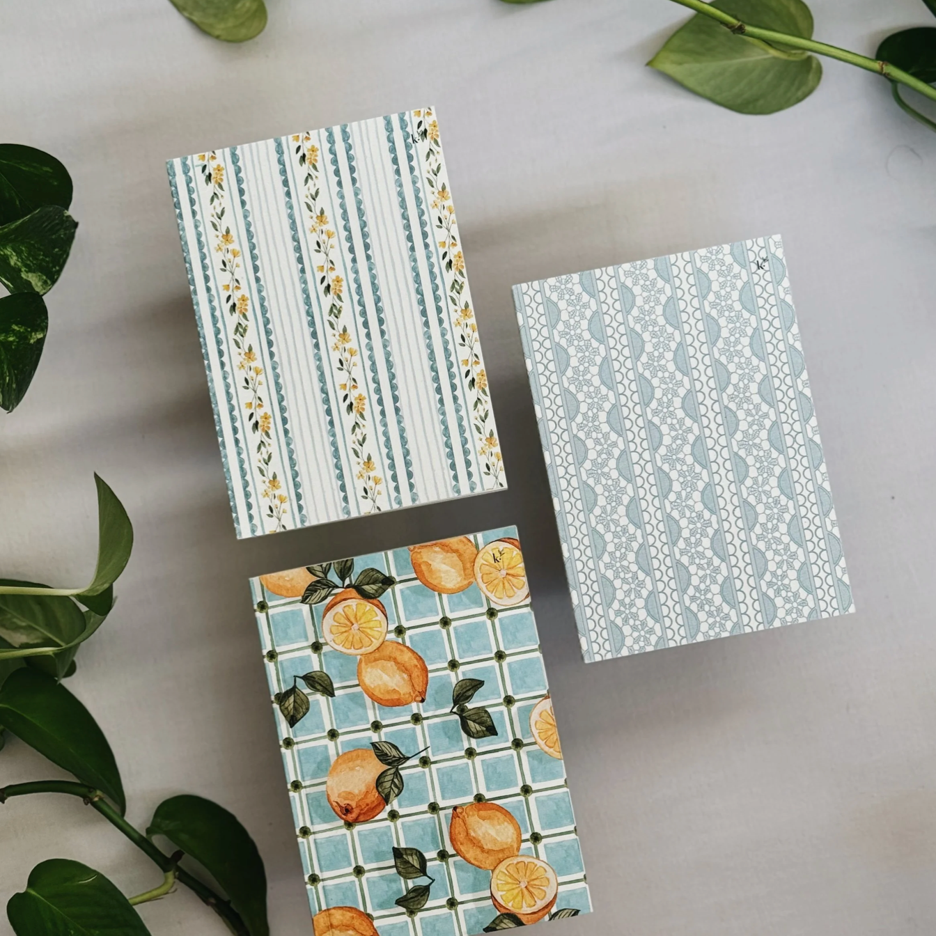 Three patterned boxes on a light surface with green leaves around