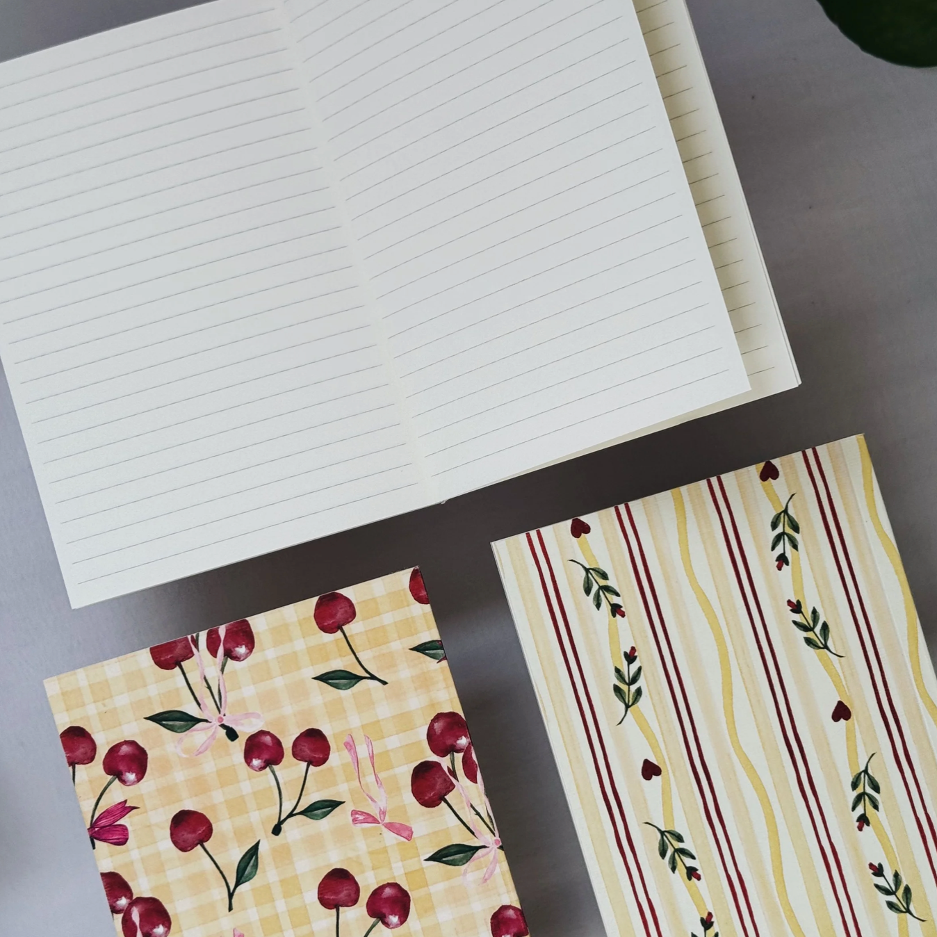 Notebook with cherry pattern, striped notebook, and lined paper on a gray surface