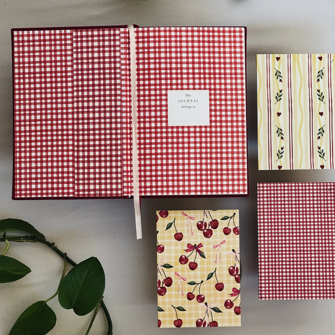 Inside, the end pages open to a charming burgundy gingham pattern and a this journal belongs to section, adding a delightful character to its minimal design. Two satin ribbon placeholders ensure you can move seamlessly between pages, making this journal a practical and beautiful companion for notes, reflections, and creative ideas.