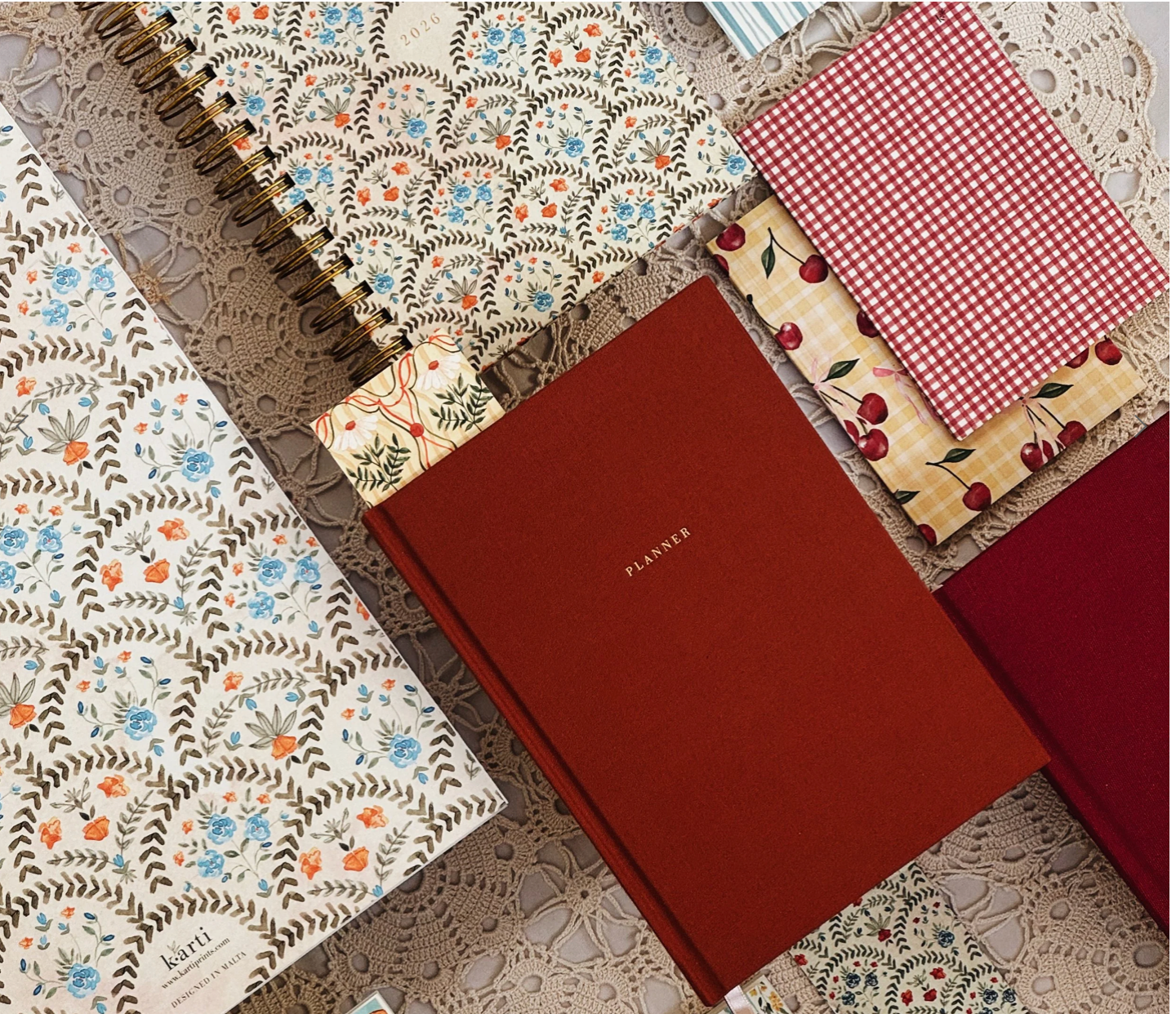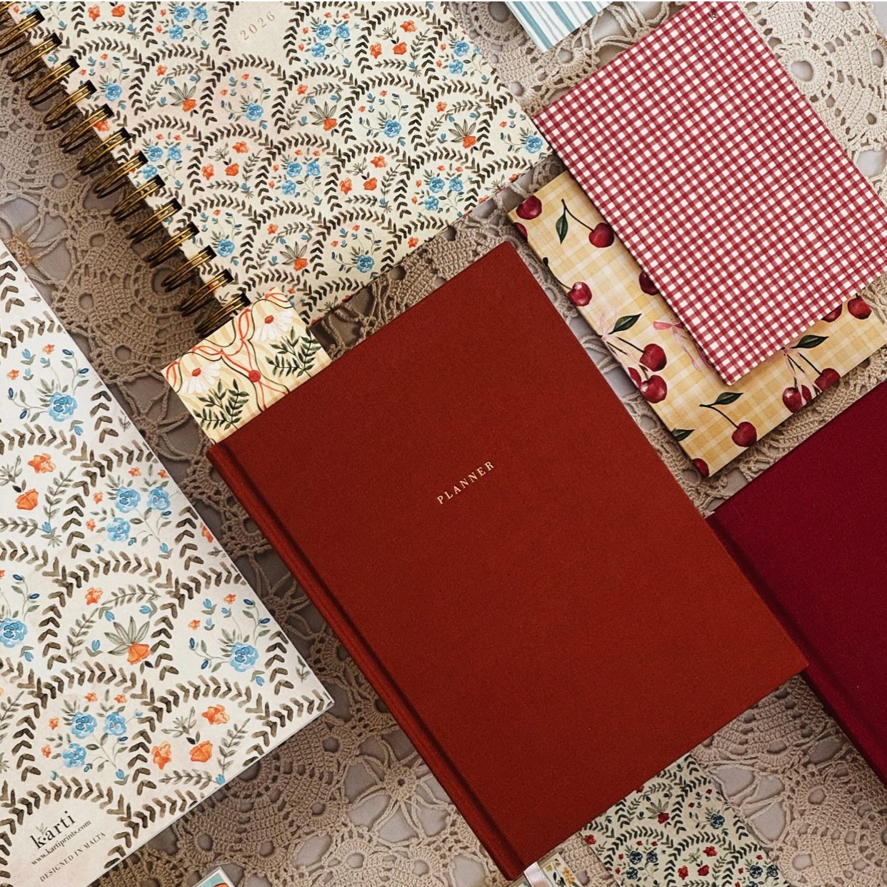 The end pages feature a detailed artwork from our nostalġija ħelwa collection, adding a touch of warmth and memory to your planning. Two satin ribbon placeholders help you find your place with ease, making the planner a truly functional companion throughout the year.