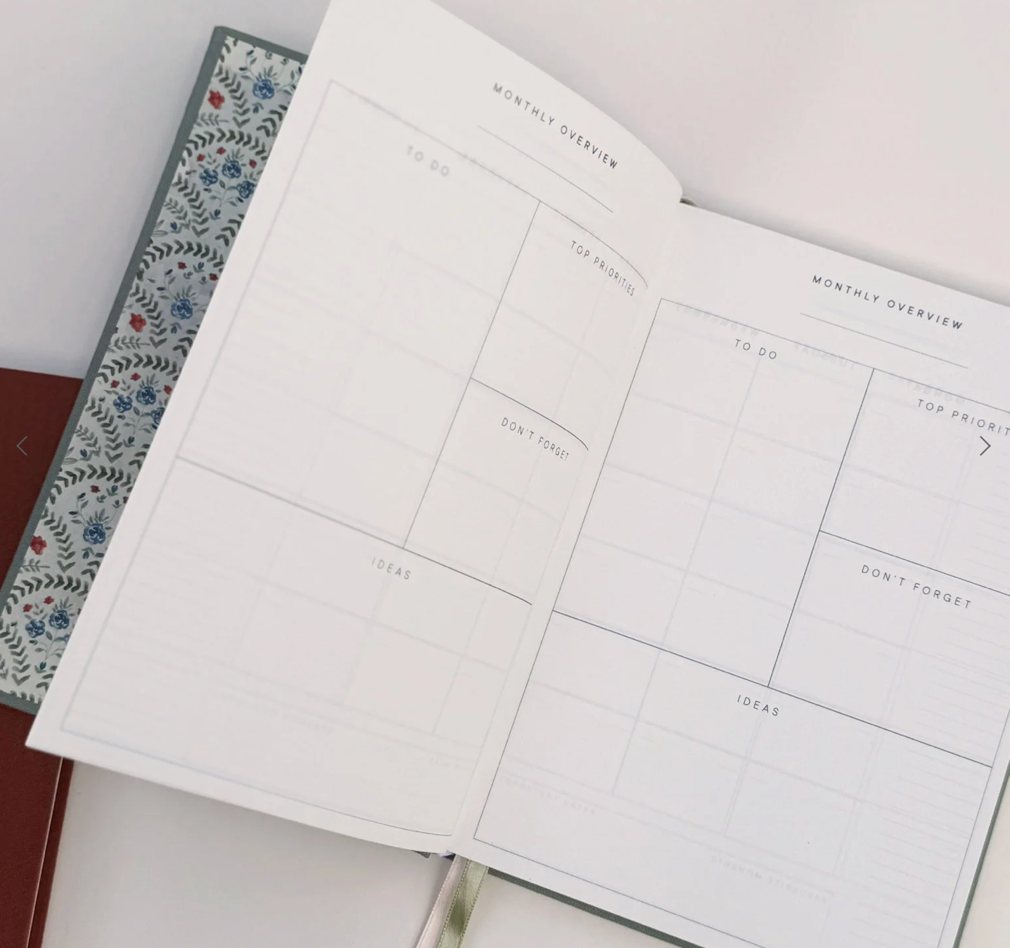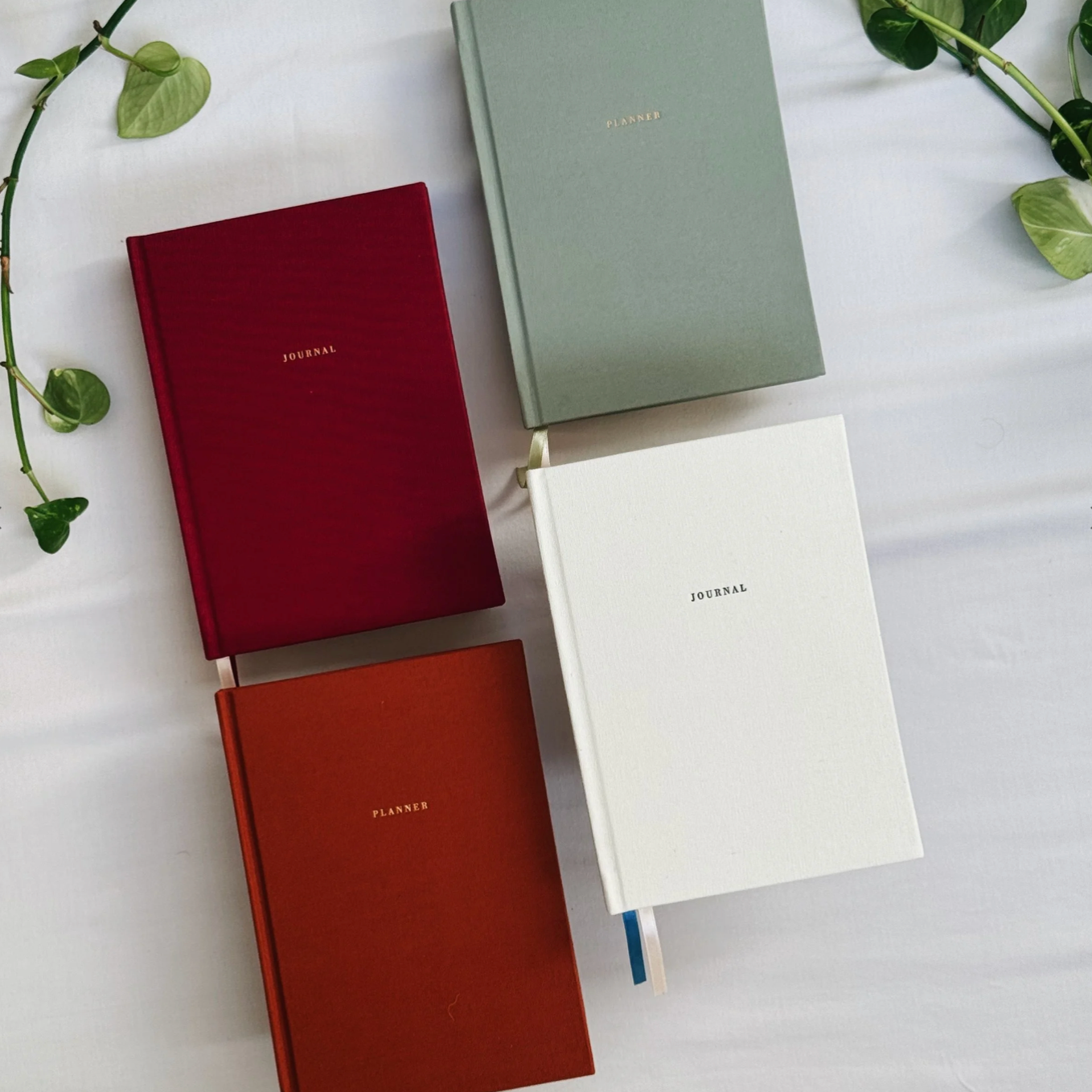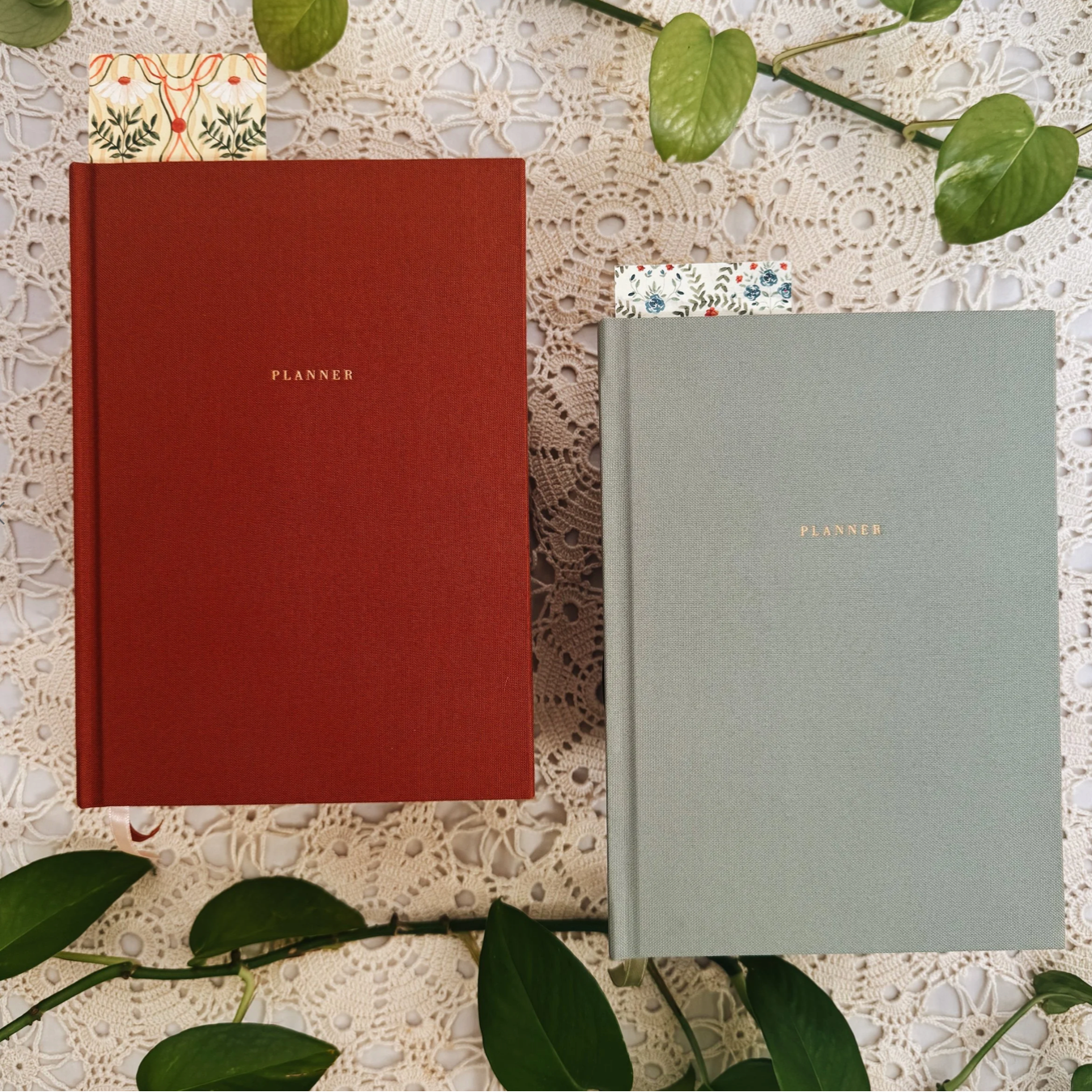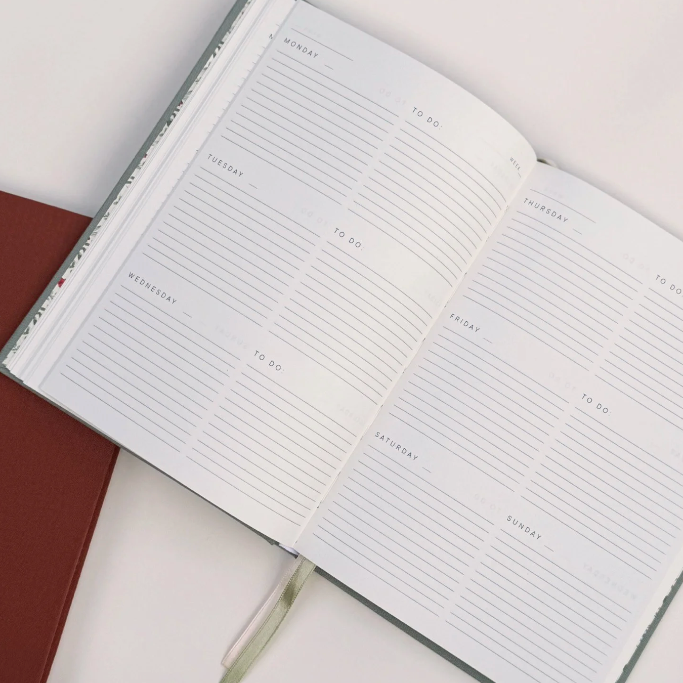 This undated planner is a gentle invitation to organise your days with clarity, calm, and intention. Minimal and elegant by design, it brings together thoughtful structure and timeless aesthetics to support you through the rhythms of everyday life. Hardbound in a linen cover with delicate gold-foil detailing, it feels as beautiful in your hands as it looks on your desk.