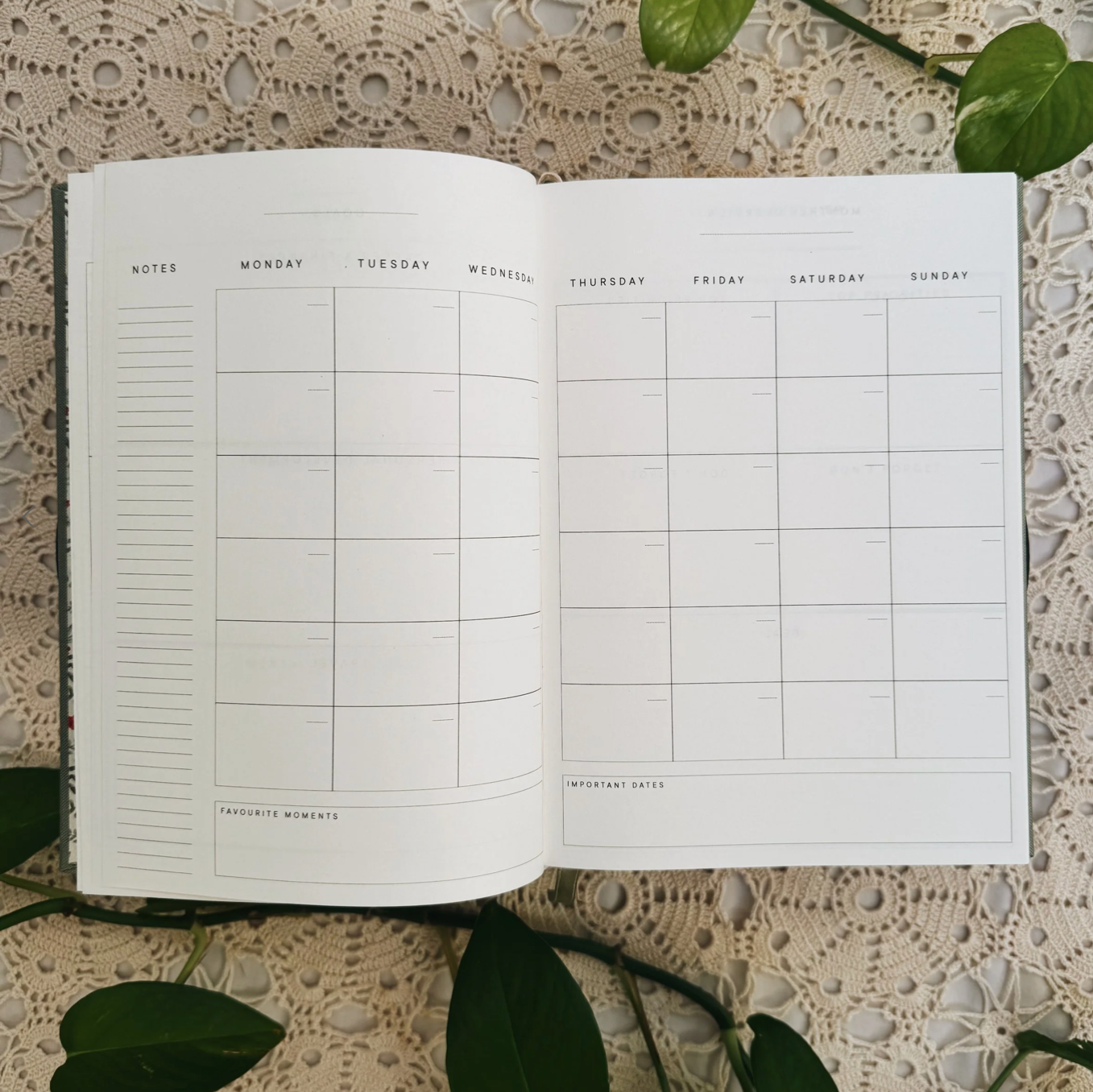 Inside, every page has been crafted to help you plan with purpose. From year-at-a-glance pages to guided goal-setting spreads, from monthly reflections to clean weekly layouts, this planner gives you the freedom to shape your days exactly as you need. Because it’s undated, you’re free to begin at any moment — no pressure, no wasted pages, only space to start fresh.
